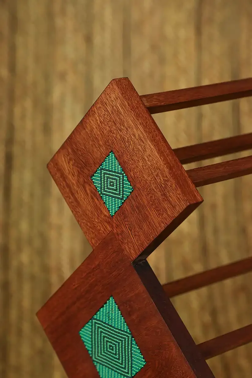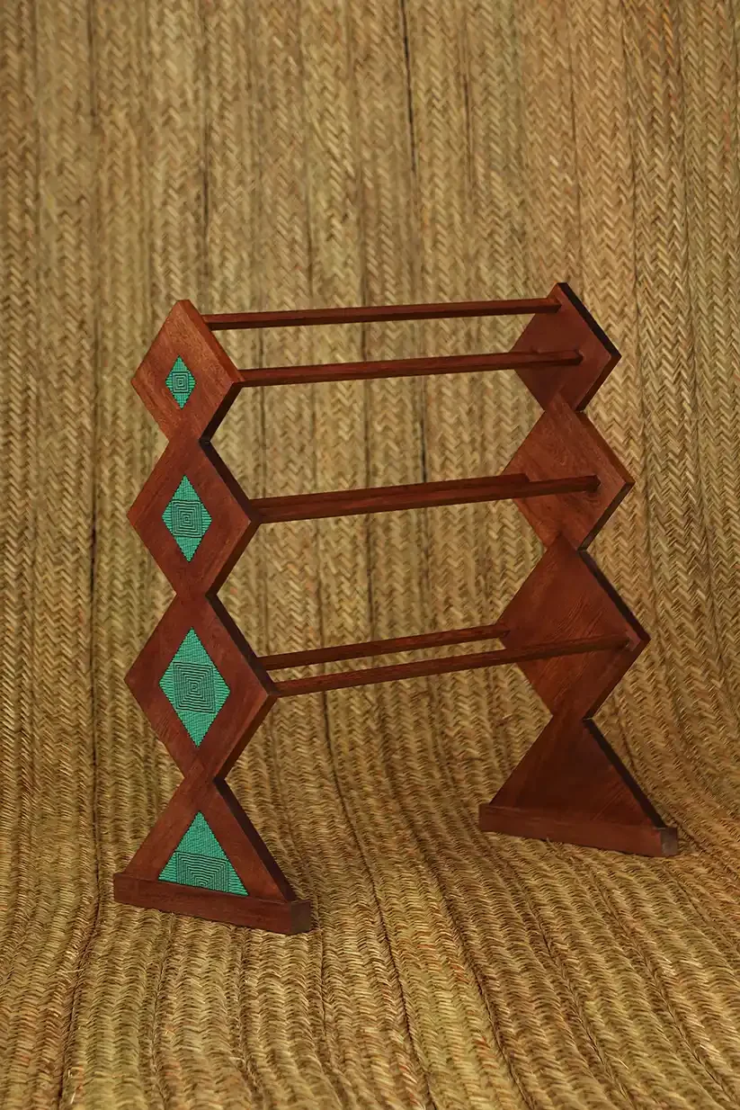 The geometric wooden clothes stand is inlaid with woven beaded details on the sides, traditionally used in making necklaces by the Kamentsa community in Putumayo in the south of Colombia. The design is inspired by cadenilla patterns from Juchitan.